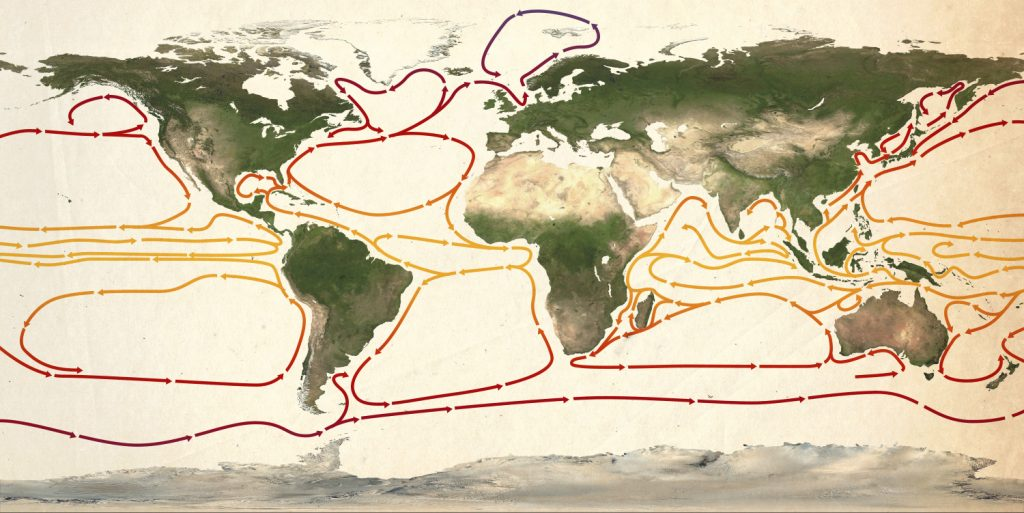 Existem correntes oceânicas que influenciam a temperatura e os eventos sazonais? (ex.: Corrente do Atlântico Norte levando água quente para o norte ou Corrente da Califórnia levando água fria para o sul).