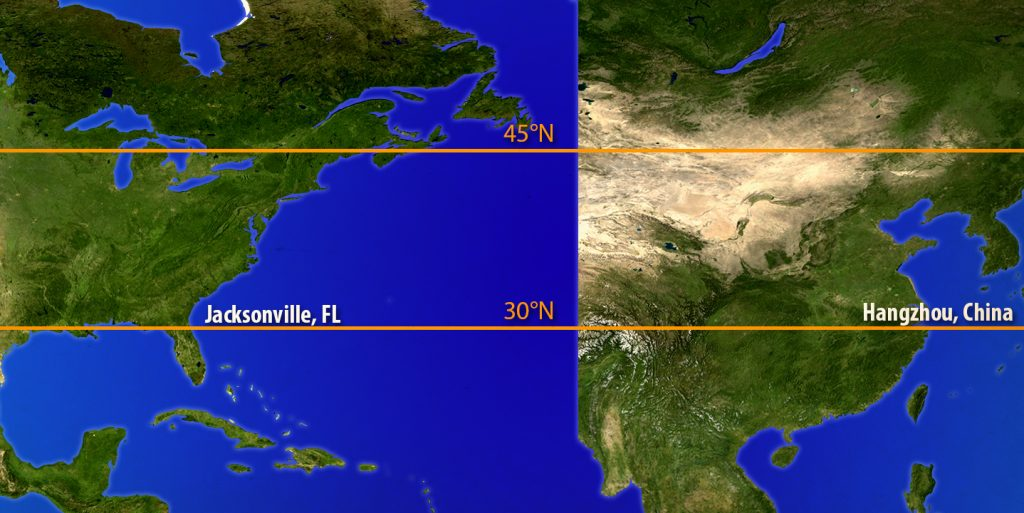 Encontrar uma latitude análoga é uma das coisas importantes e primeiras a se considerar ao identificar um análogo climático para sua localização atual. Existem os tipos gerais de clima baseados na latitude, que são as zonas glaciais, temperadas, subtropicais e tropicais nos hemisférios Norte e Sul. Cada uma dessas zonas cobre uma ampla extensão, e há diferenças significativas entre as extremidades de cada zona. Por exemplo, Anchorage (no Alasca, EUA) e São Francisco (na Califórnia, EUA) estão ambas localizadas no nível do mar, na região costeira e dentro da zona de clima temperado, mas estão a 24 graus de latitude de distância e têm variações extremamente diferentes na duração do dia e temperaturas médias diárias que diferem em mais de 10°C.